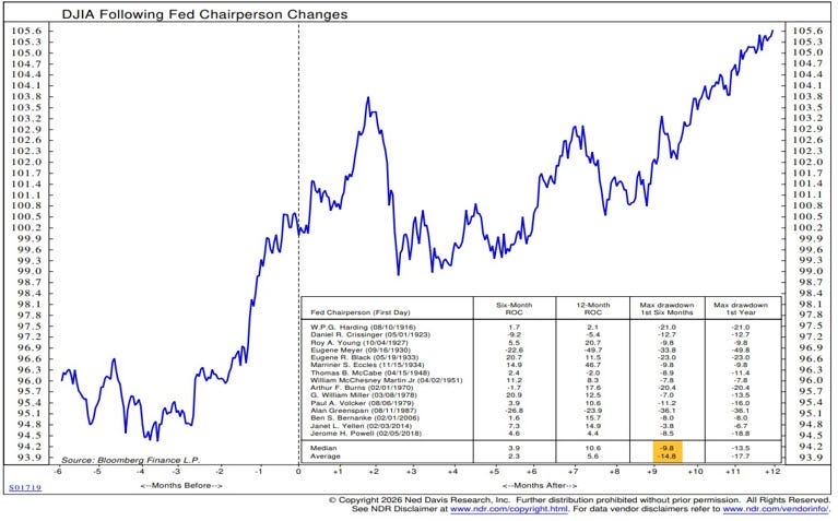 An interesting post caught my attention from the excellent Ed Clissold of Ned Davis Research. He provides some colour on the notion that the market tests new Fed Chairs early in their tenure, full post here. Ed notes, “Markets tend to test new Fed chairs. The average correction in the first six months is 15%. When the chair faces their first crisis, investors don't wait and see how they handle it.”