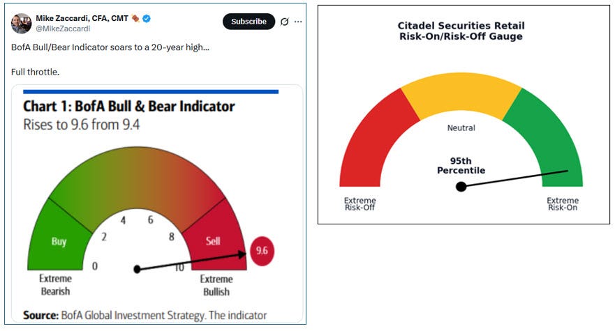 We have a bunch of mixed signals here, which isn’t terribly helpful. Bank of America’s Bull & Bear Indicator and Citadel’s Risk-On/Risk-Off Gauge are red flags.