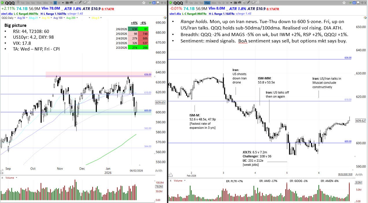 From intraweek high on Tuesday to intraweek low on Thursday, QQQ fell -5.6%. The move lower was helped along by uncertainty around America’s plans for Iran, and a flurry of weak jobs data. The support zone at the psychologically important round number 600 held, as we suggested it might last week. On Friday, QQQ bounced as news emerged that US/Iran talks had not fallen apart.