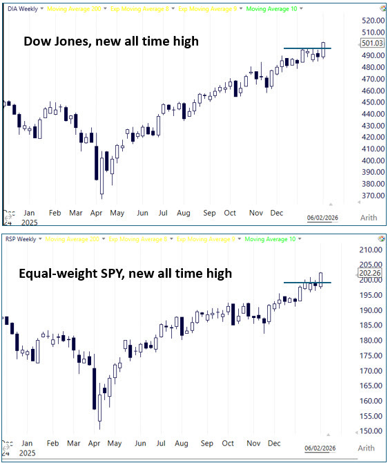 On the positive side, it’s hard to ignore the Dow Jones making a new high, along with RSP, the equal-weighted SPY.