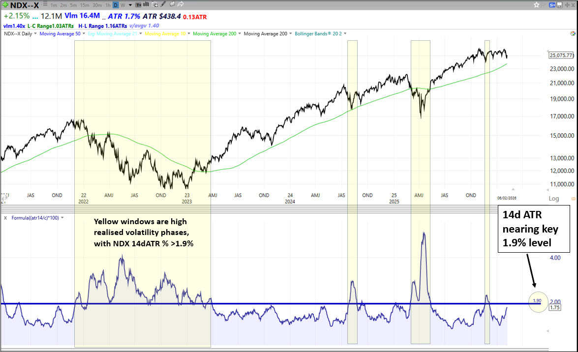 QQQ remains stuck in the range that has been in play since late September. The confluence of longer-term bullish factors still suggests a break higher could be on the cards, namely fiscal and monetary support, along with a strengthening economy and a decent earnings season. However, note that realised volatility is rising, with the Nasdaq 100’s 14dATR now at 1.8%. Readings above 1.9% are consistent with corrective or bear phases (see chart below). If we continue to shake around, then volatility-sensitive players, such as vol control funds, may start to sell.