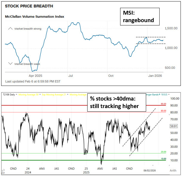 Despite the drop in QQQ, breadth held up OK this week. The McClellan Summation Index is tracking sideways, while the % of stocks above their 40dma is still more-or-less on the up.