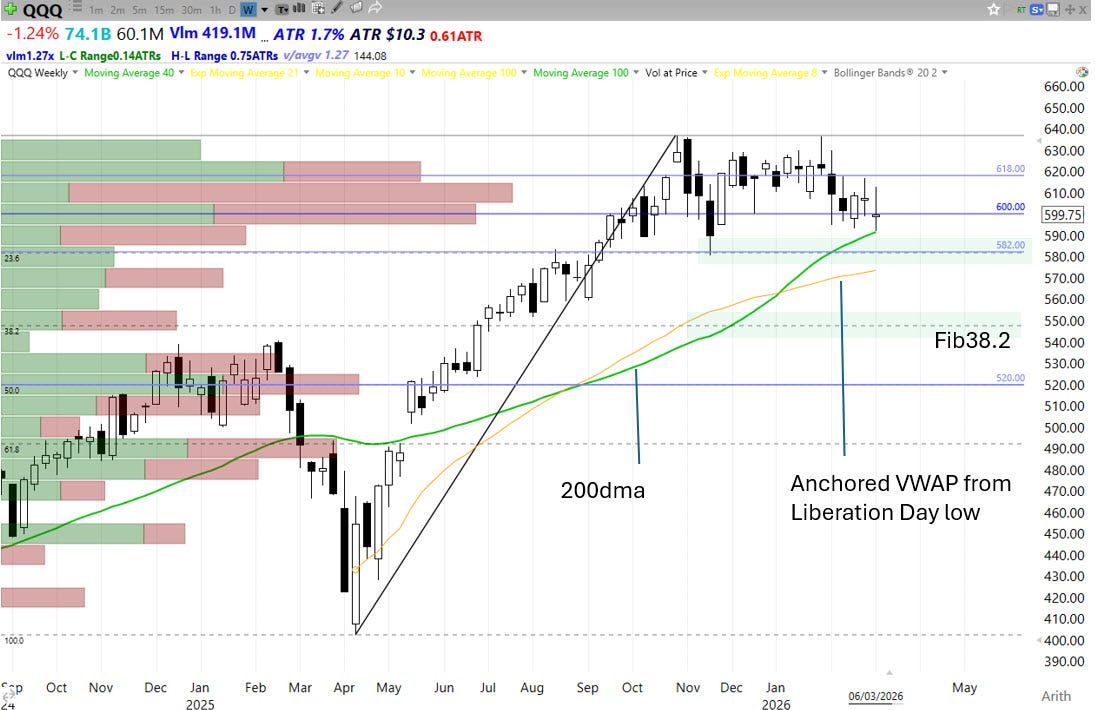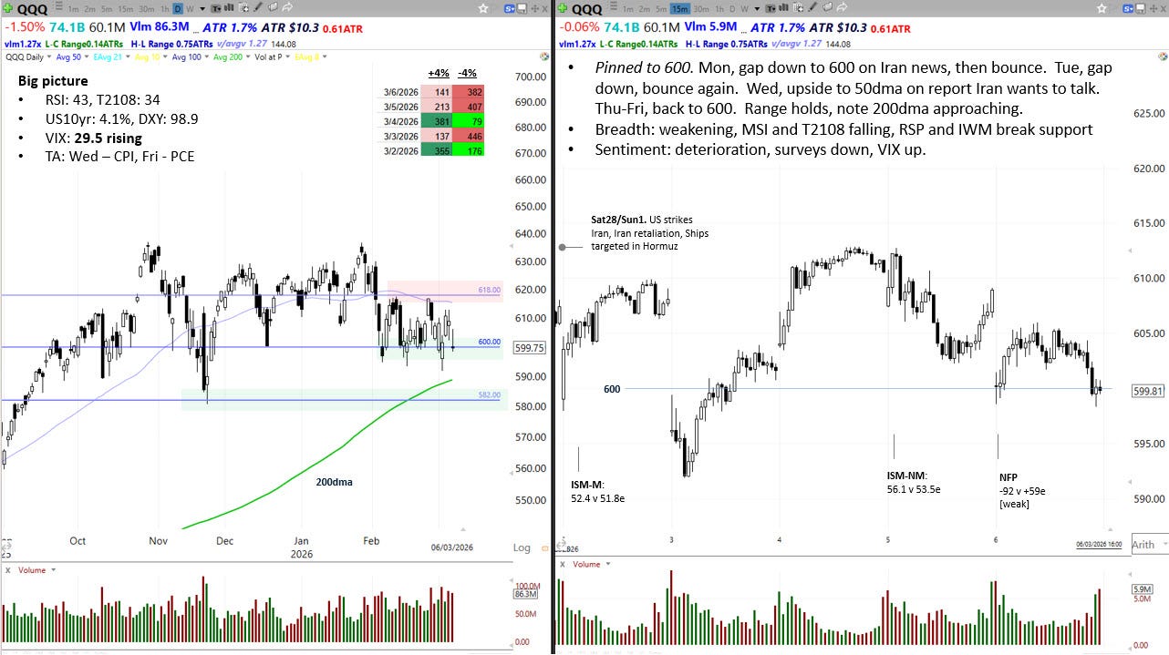 Last week, after America and Israel launched military action against Iran, we speculated that QQQ could gap down and rally at the open on Monday. That idea was based on the last major geopolitical precedent in Feb 2022 when Russia attacked Ukraine. That was indeed the pattern we saw on Monday, but for the rest of the week QQQ reverted to choppy oscillation around 600, ultimately closing at that level on Friday.