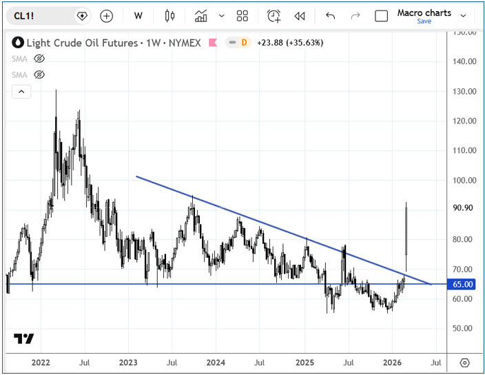 Oil has broken out. The further it goes, the greater the hit to growth, inflation, and earnings, and the greater the damage to stocks. Iran’s strategy is to push energy prices higher in the hope of reaching Trump’s TACO threshold - the point at which higher energy costs intolerably impair his midterm election prospects. So, Iran has closed the Strait of Hormuz and they are targeting regional energy infrastructure.