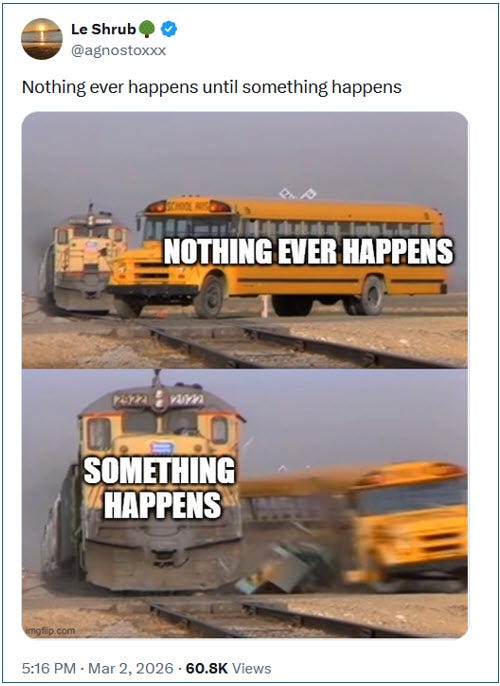 A difficult, stagflationary week for the Fed to digest. The conflict in Iran brings upward pressure on inflation via spiking energy prices, while Friday’s terrible NFPs brought signs of job market deterioration. This week’s speakers continue to reflect an FOMC split across multiple camps: