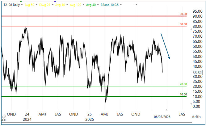Breadth: clear deterioration this week, but not oversold enough to suggest a bounce (yet).