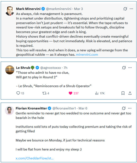 Short-term: one week into the Iran conflict and things look too unpredictable to participate. Quick resolution or drawn out crisis both plausible. Price action, breadth, and sentiment indicators aren’t lining up to suggest a bottom yet. Need to see a whoosh lower in stocks to an oversold condition accompanied by a washout in breadth (T2108 down sub 20 or even 10) and a clear washout in sentiment. To take advantage of that opportunity one has to stay out of trouble until it comes along.