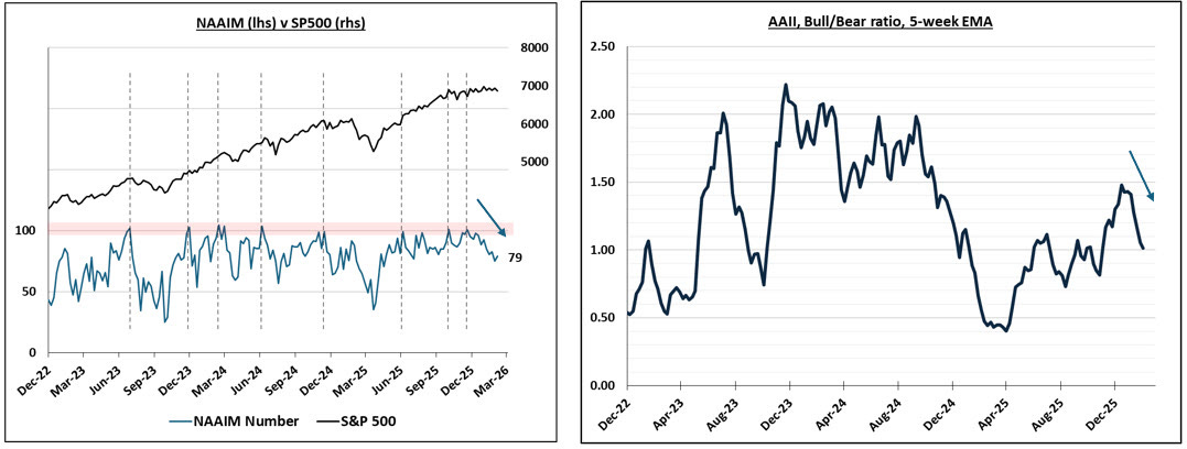 AAII and NAAIM continue to ease back as Middle East headlines intensify. However, neither show the sort of extreme sentiment washout that accompanies a major bottom in stocks. As for the IB surveys, Deutsche remains neutral as does GS.