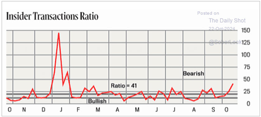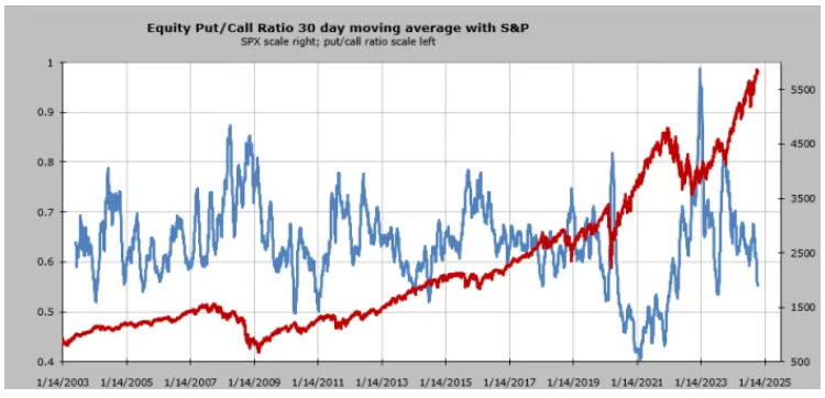 30dma of the equity put/call ratio: this has come down to around 0.54, almost the same low reached before the July 2023 pullback (source, and hat tip to, the peerless Helene Meisler).