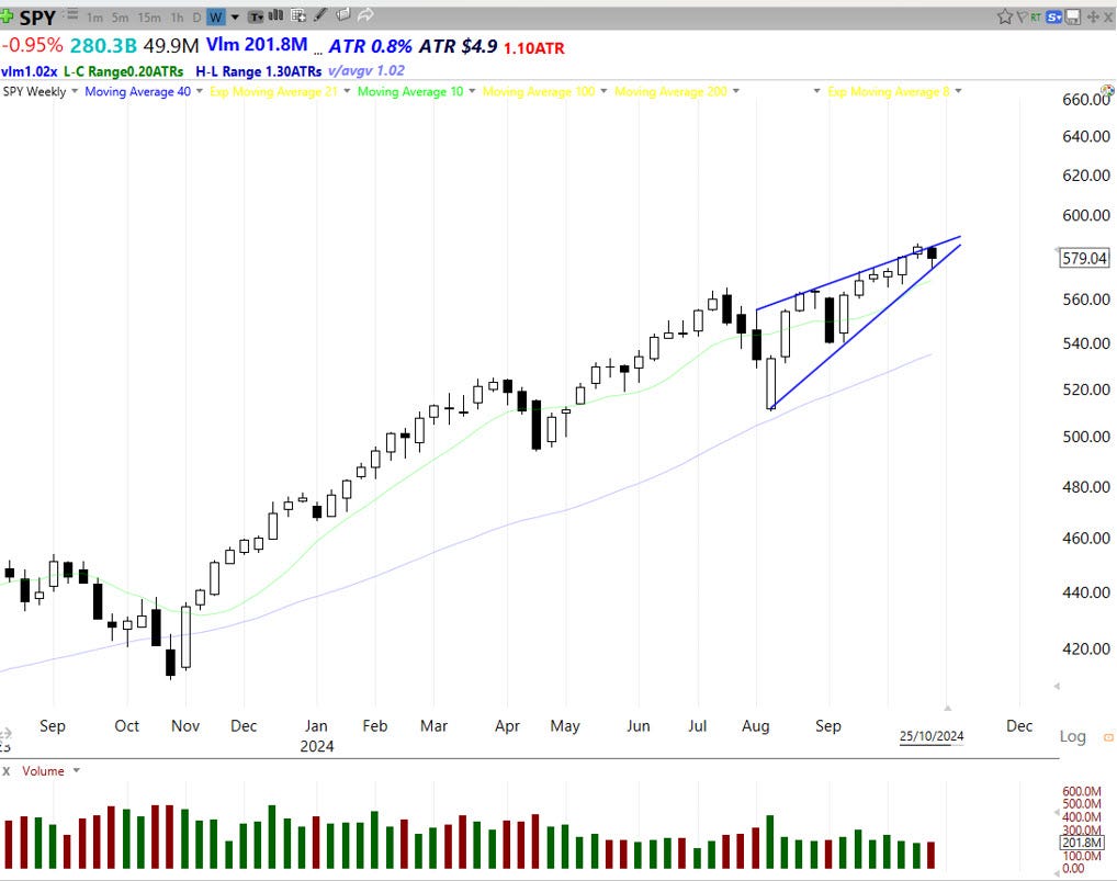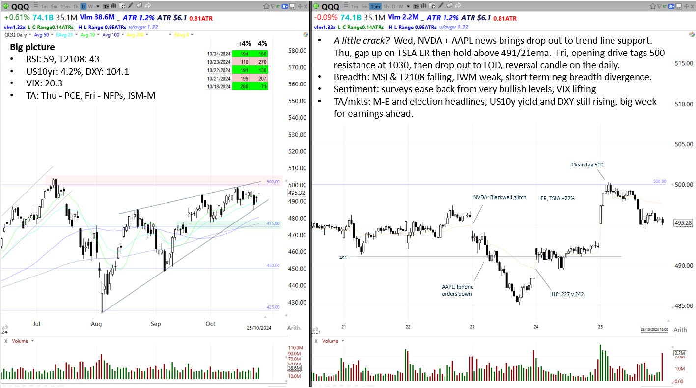 Stock specific news drove price action this week. On Wednesday, NVDA (7.6% of QQQ) pulled back -4% on reports of glitches in the development of its Blackwell chip. Then AAPL (9.0% of QQQ) pulled back -3.5% on reports of an industry survey suggesting lower than expected iPhone production. After the bell on Wednesday the news turned positive as TSLA reported strong earnings. TSLA rose +22% on Thursday, then another +3% on Friday. The weekly net result for QQQ was a bumpy grind higher. Next week is the big earnings week.