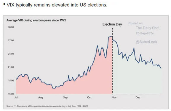At the risk of sounding like a broken record, Presidential elections are usually accompanied by volatility and a pullback (see last week’s post for a discussion of price action around the last three US elections). This election cycle the VIX has followed the seasonal pattern - rising as people seek to hedge event risk. But, realised volatility is, as yet, nowhere to be seen.