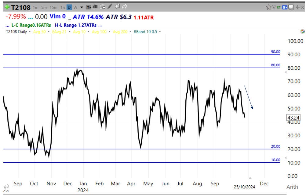 A modest negative breadth divergence has developed: QQQ and SPY are near their highs, but several breadth indicators are rolling over. This is not constructive.