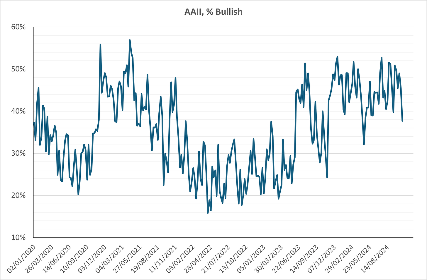 Over the last few weeks sentiment became very bullish, to the point where it has suggested a contrarian bearish signal. Several longer term sentiment indicators look stretched: