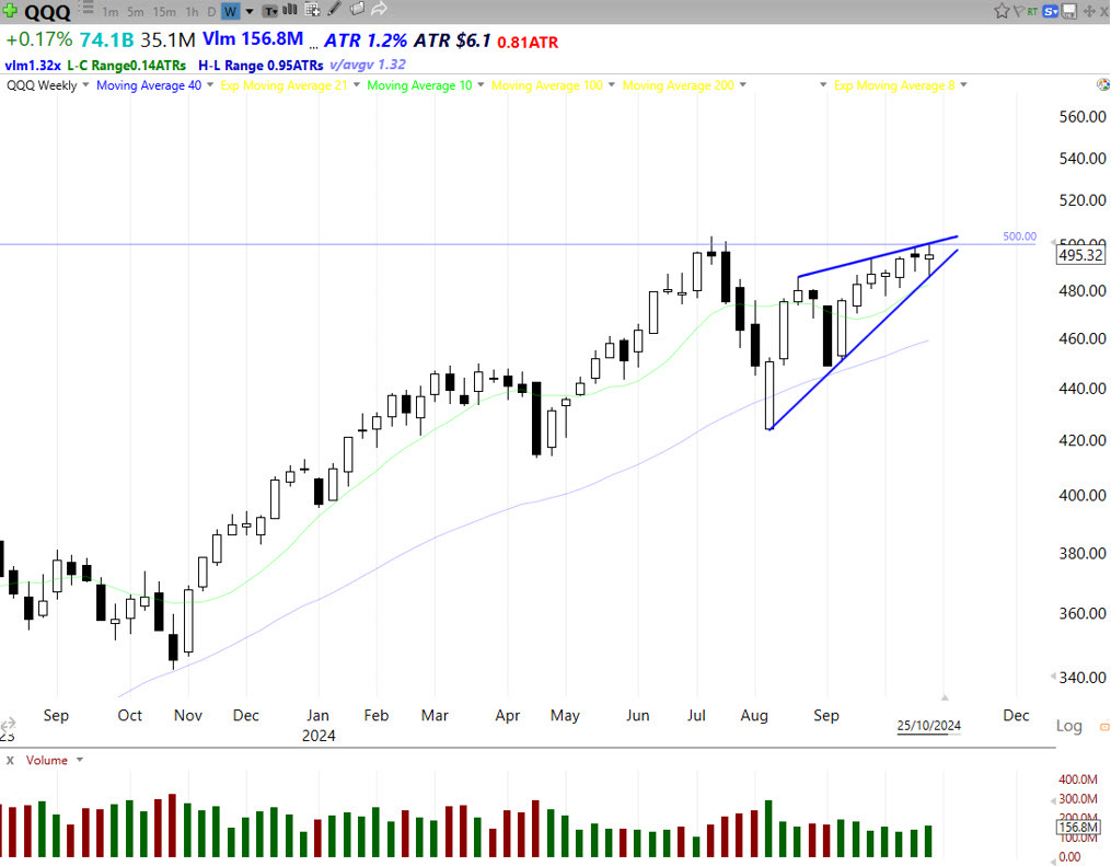 Price action: QQQ continues to grind higher, but note 500 acted as clean resistance on Friday. Ascending wedge patterns in QQQ and SPY remain unresolved. The longer term bullish trend remains intact.